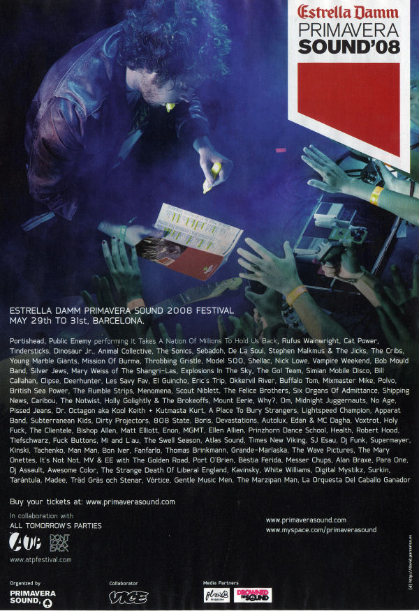 Il forum. Il mare. La gente in coda per entrare. Tutto così familiare e bellissimo. Ci siamo anche quest’anno e siamo pronti per ricominciare. Le vittime sacrificali, quest’anno, sono gli MGMT, pompatissimo gruppo hyper-pop. Al sottoscritto non piacciono. I singoli, anzi, mi danno un grande senso di fastidio e non mi aspetto niente dal live che si dimostra moscio oltre ogni dire. Ulteriore fastidio. Probabilmente ci avevo visto giusto e il discorso è chiuso ancora prima di iniziare. Esagerazione mediatica. Molto meglio Phil Elverum indaffarato con un doppio set equamente diviso tra Mount Eerie e Microphones. Grandi canzoni e grande folk per appassionati. C’è tempo di una piccola pausa prima di andare a sentire gli Enon sul nuovo palco “Vice Jagermeister”, posizionato a bordo mare dopo una scalinata di tibetana lunghezza (farla alle cinque del mattino ti toglie ogni residuo di vita). I newyorchesi ci sanno fare, ma un mix non all’altezza affossa le chitarre limitando la botta alla granitica sezione ritmica. Occasione persa. Ci pensano i Notwist a tirar fuori un gran bel set, nonostante la presenza scenica propria degli ingegneri tedeschi. La IDM-band sa anche fare grande pop lanciandosi in schitarrate che non mi sarei mai immaginato. “The Devil, You + Me” è una bella sorpresa se pensiamo che l’ambiente ha da tempo bollato l’indietronica come “merda” e che molti di noi non si aspettavano poi molto. La gente comincia a spazientirsi: vogliono tutti i Portishead. Io e la mia compagnia di flippati headbangers, invece, ci lanciamo nel viaggio andato a male degli Eric’s Trip. Alfieri canadesi della Grunge Generation dimenticati pure da quella Sub Pop che aveva pubblicato i dischi. Chi si sarebbe filato una loro reunion? Beh, ovviamente in Spagna sono in molti e il loro set è seguito da un bel po’ di flippati. Peccato che la band non suoni assieme da un sacco di tempo e sia slegata come non mai. Facessero a gara a suonare più alto sarebbe stato per lo meno divertente, ma così, invece, si è persa una buona occasione per accendere il fuoco del culto. Sarà per un’altra volta. Forse.
