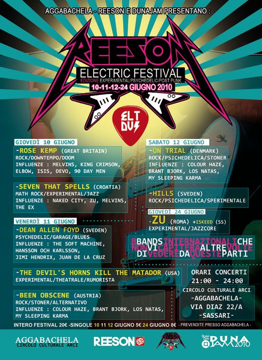 Manca ancora la serata di chiusura al Reeson Electric Festival a Sassari. Gli Zu (preceduti dai sassaresi Iskeed) suoneranno il 24 giugno nel locale Aggabachela che ospita la rassegna e si preannuncia un finale col botto. Ma le immagini che rimangono nella memoria sono le esibizioni dei sei gruppi internazionali (diventati sei dopo la defezione degli statunitensi Devil’s Horns Kill the Matador) che hanno portato sul palco del locale sassarese musica di altissima qualità. Bisogna dare subito merito agli organizzatori della kermesse di aver dato vita a un appuntamento musicale che dalle parti di Sassari e in generale del nord Sardegna è una vera e propria rarità. Purtroppo il pubblico non ha risposto come ci si poteva aspettare. Non tanto per disinteresse, quanto per una vera e propria “allergia” ai biglietti d’ingresso di qualsiasi entità (in questo caso l’ingresso per ogni serata era di appena 5 euro). Aver visto il locale pieno solo a metà durante i concerti e poi strapieno dopo (quando non si pagava più l’ingresso) ha lasciato giustamente un po’ di amaro in bocca a chi comprende l’importanza di concerti come quelli dell’Electric Festival.