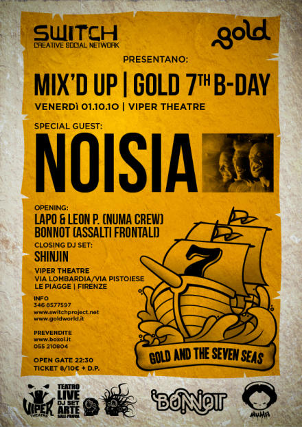 L’evento, firmato Switch – creative social network & Gold – brand streetwear, proposto in occasione del 7° compleanno del marchio d’abbigliamento, avra’ l’onore di ospitare quest’anno NOISIA, una delle realta’ piu’ affermate nel panorama drum ‘n’ bass internazionale. La manifestazione alle prese con le nuove tendenze dell’elettronica europea sposta inoltre la sua attenzione anche su sonorita’ dubstep, ospitando in apertura Lapo e Leon P (Numa Crew) e in chisura Shinjin, tre dei nomi piu’ noti nel panorama underground fiorentino. Poco prima della performance di Noisia il set di Bonnot (al secolo Walter Buonanno), polistrumentista, dj e producer di Assalti Frontali.