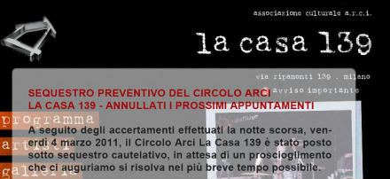 Con un comunicato che sembra, purtroppo, più un dispaccio del Pubblico Ministero è stata data la notizia che a seguito degli accertamenti effettuati venerdì 4 marzo 2011, il Circolo Arci La Casa 139, in Via Ripamonti a Milano, è stato posto sotto sequestro cautelativo.