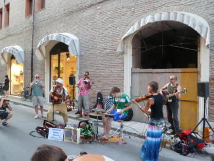 Davanti al duomo si esibiscono i britannici Swing Ninjas, con il loro accattivante jazz gitano, fra swing e patchanka balcanica, lungo la via già aperta dal grande Django Reinhardt. Chitarra, sax, basso-tuba e elicone: il trio diverte ma forse non stupisce quanto vorrebbe. Poco più in là troviamo il soft rock romantico del brasiliano Tupahn, chitarrista ormai habitué del festival: i suoi strumentali, spesso arrangiamenti di pezzi celebri (Beatles, Procol Harum ecc.) con sfoggio di manierismo tecnico, irretiscono con efficacia ma stancano come la pasta di mandorle. In una stretta via la gente fa capannello attorno alla Babbutzi Orkestar, italianissima malgrado il nome: la musica klezmer fa quasi sempre presa. Ancora swing festoso e popolare, ma più classico – chitarra, clarinetto, batteria -, con i tre Oum Tcha.