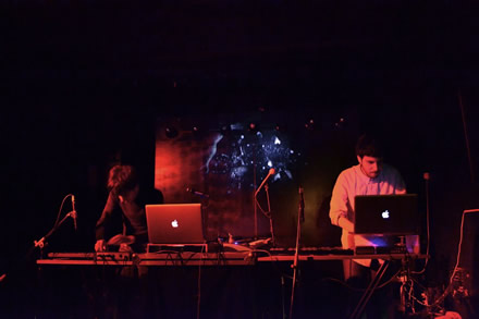 Le basi registrate ovviamente ci sono, ma sono appunto solo basi. Quello che viene intessuto sopra di queste è un affascinante tela dove si intrecciano tastiere, xilofoni giocattolo e parti vocali ben calibrate. Non è un sound d’insieme freddo, come ci si potrebbe forse aspettare, ma invece ricco di calore e comunicativo. Il pubblico inizialmente diviso tra i pochi fan e i curiosi dimostra di apprezzare sin dai primi minuti, lasciandosi coinvolgere nel gioco di suoni e sensazioni che i due musicisti forlivesi riescono a mettere in scena.