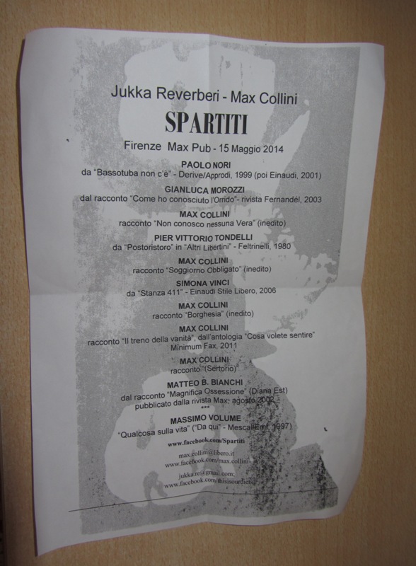 La musica non colta è considerata in Italia musica di serie B, un po’ come i B-movie degli Anni Settanta, fatti con pochi soldi e distribuiti in sale sparute. Eppure Mario Bava – per citarne uno – con budget risibili, film dopo film, ha portato avanti un immaginario dell’orrore a tinte forti, prima in bianco e nero, poi a colori. Lo spettacolo “Spartiti”, nato dall’incontro tra Max Collini (Offlaga disco pax) e Jukka Reverberi (Giardini di Mirò, Crimea X…), occupa uno spazio esiguo e non richiede grossi investimenti. Il macrocosmo entra nel microcosmo: i racconti di più vite popolano il palco di un piccolo pub fiorentino vicino alla stazione S. Maria Novella, il Max Pub.