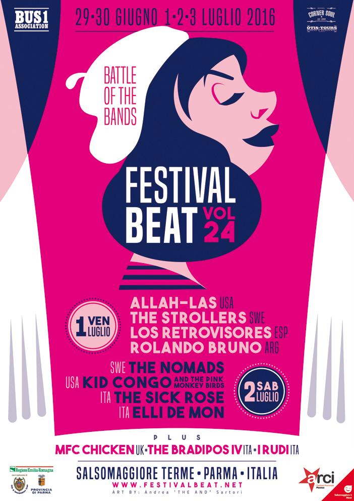 Il Festival Beat è giunto alla ventiquattresima edizione. Anche quest’anno a Salsomaggiore Terme (Parma) si festeggia, come da tradizione ed in grande stile, sulle note beat, garage e rock’n’roll. Nelle scorse edizioni i grandi nomi sono mai mancati e, pure questa volta, il programma non delude: presente in cartellone una band storica come The Nomads, esponenti cardine del revival garage rock svedese anni ottanta; Kid Congo Powers, il chitarrista nei primissimi Cramps, nei The Bad Seeds di Nick Cave ( anni 86-90) e nei Gun Club di “The Las Vegas Story” (1984) e di tanti altri dischi fino al 1995; i Sick Rose, bandiera power pop italiana nel mondo; i giovani Allah-Las, da Los Angeles tra garage e surf rock. E poi in contemporanea ai concerti si svolgono due manifestazioni extra musicali: la Mad Beatle Boots Race (gara di corsa con i famosi Beatle Boots) e la Hat Passion!, mostra dedicata ai cappelli in esposizione al Palazzo dei Congressi di Salsomaggiore.