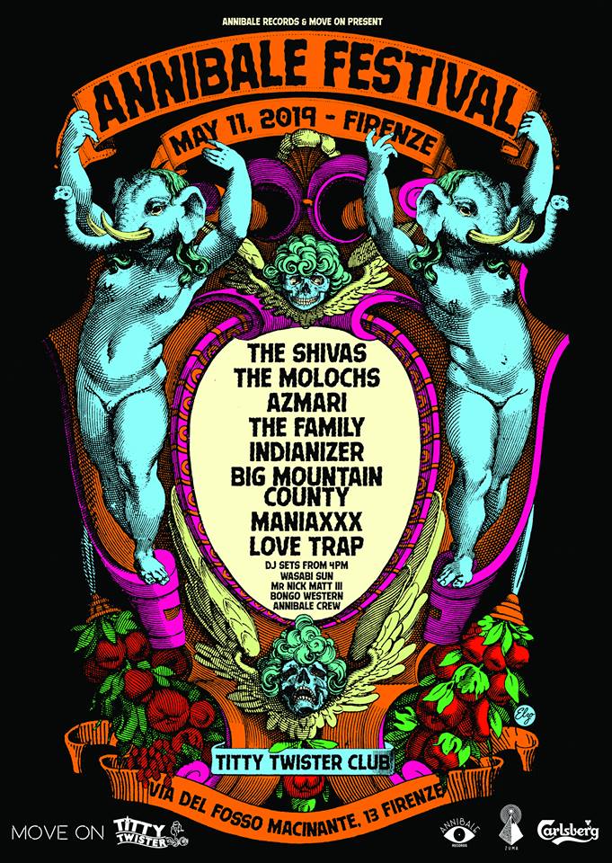 Sabato 11 maggio arriva al Titty Twister di Firenze la prima edizione del festival targato Annibale Records in collaborazione con Move On, pub e negozio di vinili del centro storico della città dantesca : una giornata – dalle tre del pomeriggio fino a notte fonda – all’insegna del garage, della psichedelia, dell’afrobeat venato di funk con The Molochs, The Shivas, Azmari, The Family, Indianizer, Big Mountain County, Maniaxxx e Love Trap.