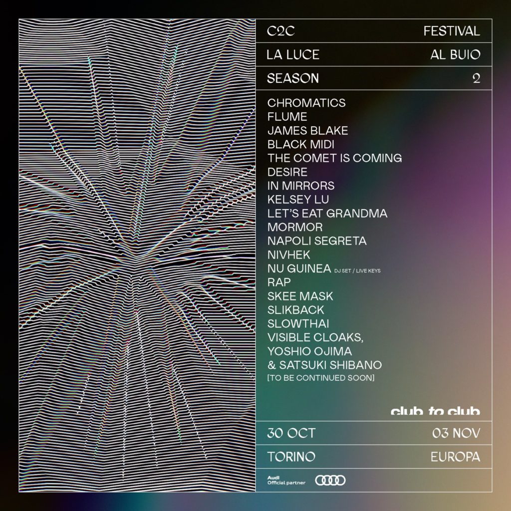 Secondo annuncio per l’edizione 2019 di Club To Club che dopo aver confermato James Blake porterà a Torino Chromatics, Flume, Black Midi, The Comet Is Coming, Desire, In Mirrors, Kelsey Lu, Let’s Eat Grandma, Mormor, Napoli Segreta, Nivhek, Nu Guinea [Dj Set ╱ Live Keys], Rap, Skee Mask, Slikback, Slowthai, Visible Cloaks, Yoshio Ojima & Satsuki Shibano. Molti nomi da scoprire e tanti nomi che vi abbiamo fatto scoprire su queste pagine. E ovviamente arriveranno molte altre conferme.