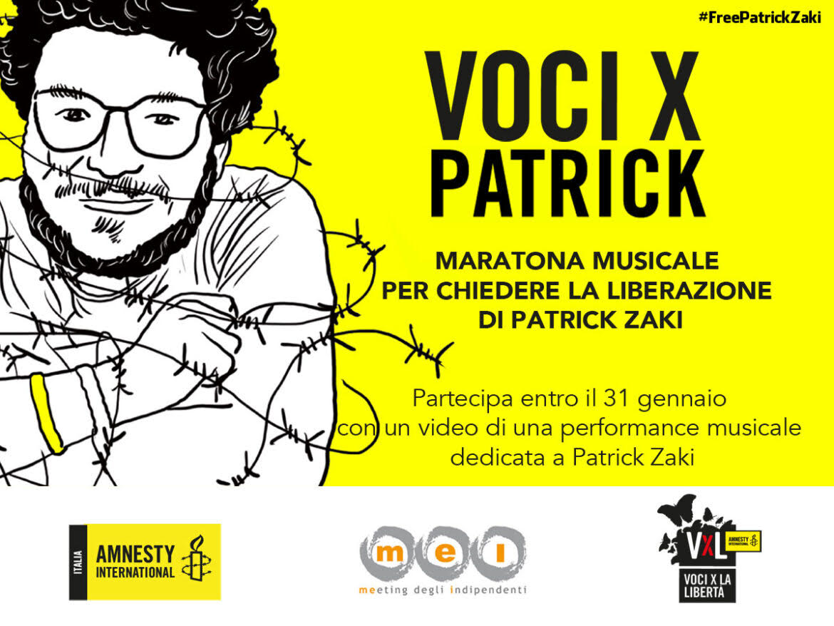 L’8 febbraio sarà il primo triste anniversario dell’arresto di Patrick Zaki. In quell’occasione Amnesty International Italia, MEI – Meeting delle Etichette Indipendenti e Voci per la Libertà organizzano “Voci X Patrick – Maratona musicale per chiedere la liberazione di Patrick Zaki” , un evento per chiedere l’immediato rilascio dello studente egiziano, che è detenuto in carcere come prigioniero di coscienza a causa del suo lavoro per i diritti umani e per le sue opinioni politiche espresse sui social media.