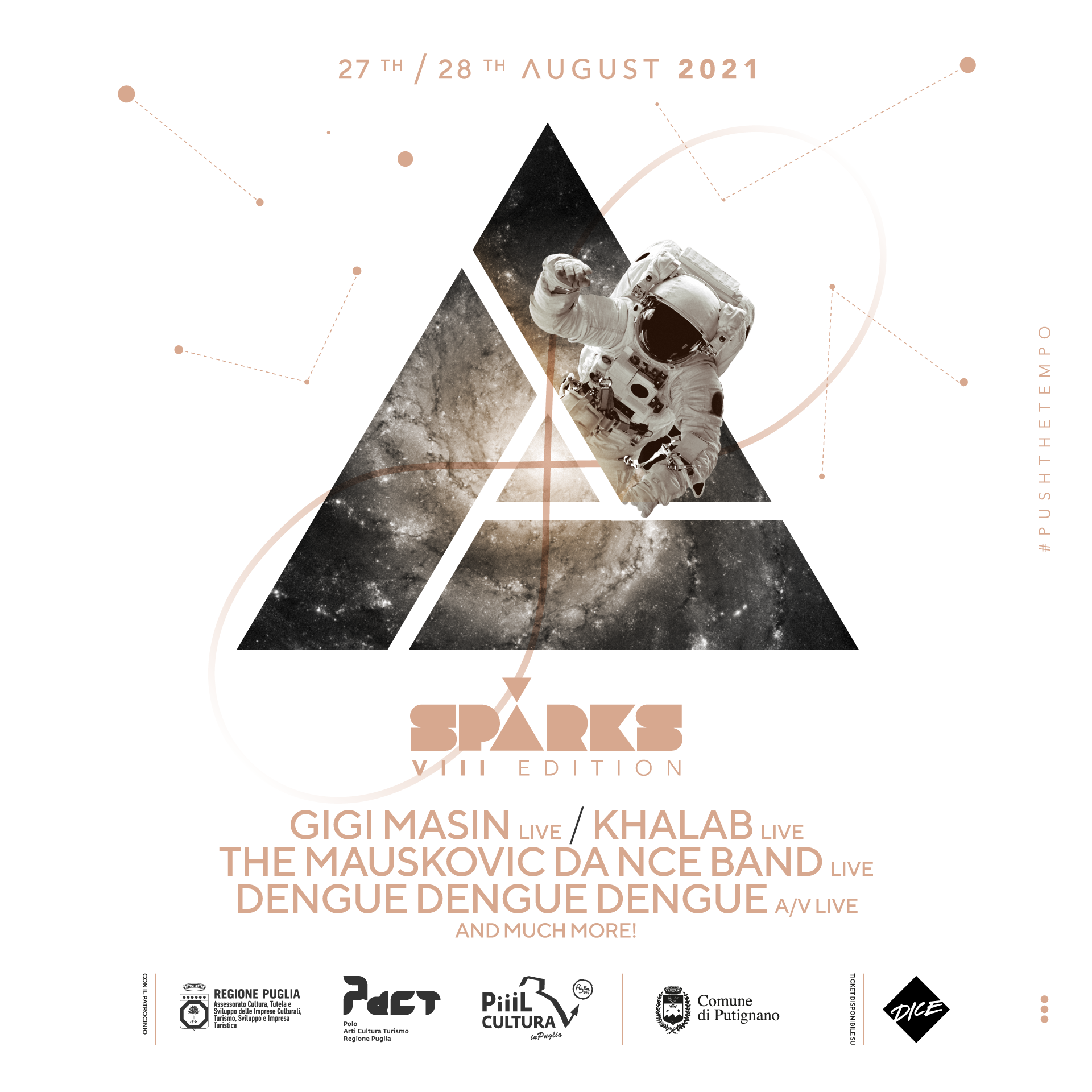 SPARKS Festival è sempre in missione verso nuovi mondi, alla ricerca di nuovi suoni, nuove forme di vita, nuovi stimoli. Push the tempo è il tema che caratterizza questa edizione, in linea con il concetto di forzare il tempo, ricercare, andare oltre. Come nel nastro del matematico Möbius, presente nell’artwork di questa edizione, dove il tempo è un’illusione e può essere piegato a favore di una visione della vita priva di costrizioni temporali e ideologiche.