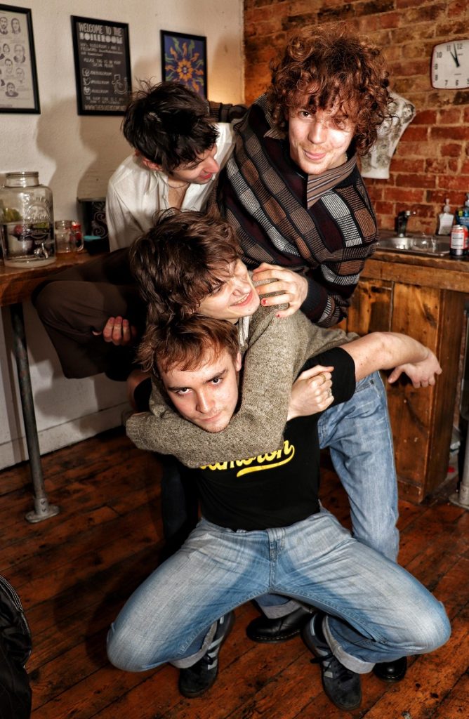 Un’idea su come suoni il quartetto di Hebden Bridge ve lo può dare perfettamente la foto qui sopra: compatti. Uno sopra l’altro. Somma delle parti migliore del singolo elemento. Cameron Davey è un piccolo Jeff Buckley ma con la risolutezza di un David Thomas (Pere Ubu), interpretazione più che voce; i chitarristi Herbie May e Hani Paskin-Hussain tecnici quanto glam nelle pose e Archie Dewis alla batteria motore e quasi equilibrista del sound del gruppo – non a caso è lì a tenere su gli altri.