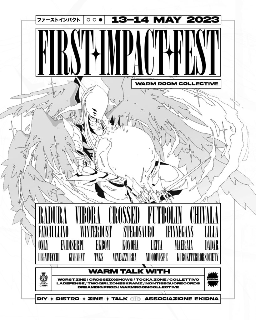 Ekidna (San Martino sul Secchia), ex scuola elementare riconvertita in associazione a difesa dell’etica anticonsumista DIY, ospiterà venti band e diversi spazi di dialogo (WARM TALK). Ciò vuol dire mettere da parte l’abitudine di andare sottopalco a prendere ciò che ci serve, e iniziare a ripensare al nostro ruolo, ammesso che ne abbiamo uno, all’interno di un topos di riferimento. I momenti di confronto previsti con band, etichette e distro, mi ricordano quell’insegnamento che fa: “Alle feste, a mani vuote, non ci si presenta mai”. Vale per chi è in prima linea, ma anche per chi si presenta a tavola già apparecchiata.