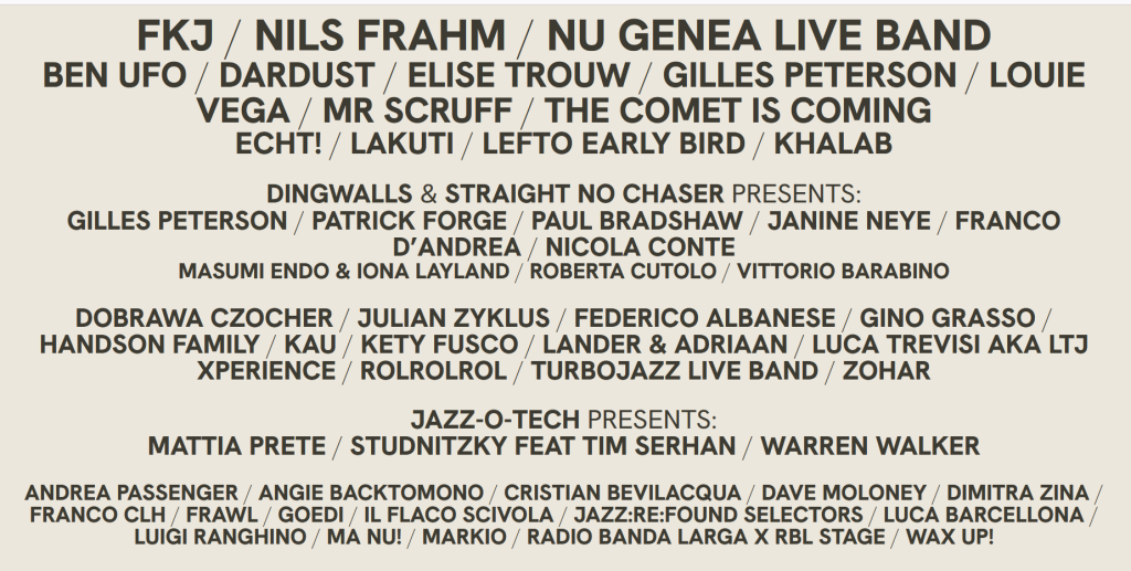 Diversi palchi e location vedranno tra gli altri : FKJ, Nu Genea, Nils Frahm, Gilles Peterson, Louie Vega, Dardust, Elise Trouw, Nicola Conte e The Comet is Coming (cartellone completo qui: link)