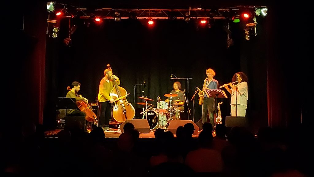 Sia l’album che la canzone di apertura del disco (e del concerto di Bologna) prendono il nome dall’etichetta discografica Bishara di Abdul Wadud, un violoncellista americano mancato l’anno scorso, che è un po’ l’artista vate ed ispiratore del progetto di Skinner (ha dichiarato che è stata la sua “ossessione durante il lockdown”). Ieri sera infatti il quintetto ha suonato pure tre canzoni tratte dal primo album di Abdul Wadud, “By Myself” (1977), interamente composto e suonato con il solo violoncello: “Oasis”, “Happiness” e “Camille” hanno trovato un’estensione comunitaria con splendidi interventi di sax della Carmichael e una base solida del contrabbasso di Herbert, per non parlare dell’estro istintivo di Dayes. Sia dunque la produzione originale che quella coverizzata è stata amalgamata dai cinque come se si trattasse della stessa pasta, con qualche piccolo spazio agli assoli personali senza che questi potessero sovrastare il concetto unitario del progetto. Con il picco di una “The Journey” che è al livello di roba newyorkese di fine ’50/inizi ’60.