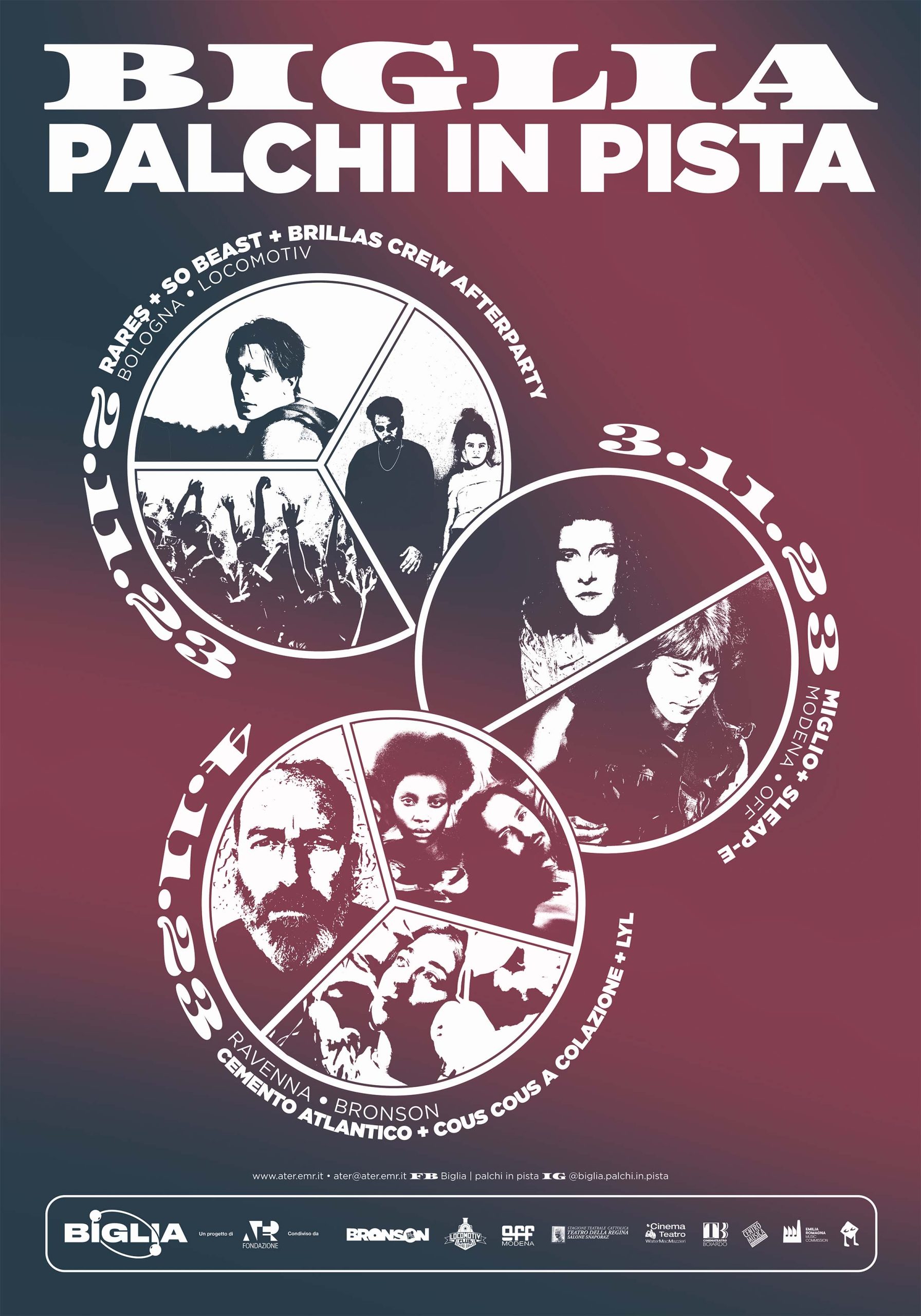 La nuova iniziativa ha il nome di BIGLIA Grand Tour e pone l’attenzione su tre appuntamenti con otto tra le migliori proposte musicali del territorio. In tutte le sue iniziative BIGLIA continua a sostenere i gruppi della Legge Musica, confermandosi l’unica piattaforma regionale che promuove la circuitazione delle giovani band del territorio, a supporto della musica originale dal vivo. La Regione Emilia-Romagna è al centro del tour, sia come luogo di origine ma soprattutto come territorio di studio, crescita e sperimentazione per gli artisti coinvolti.