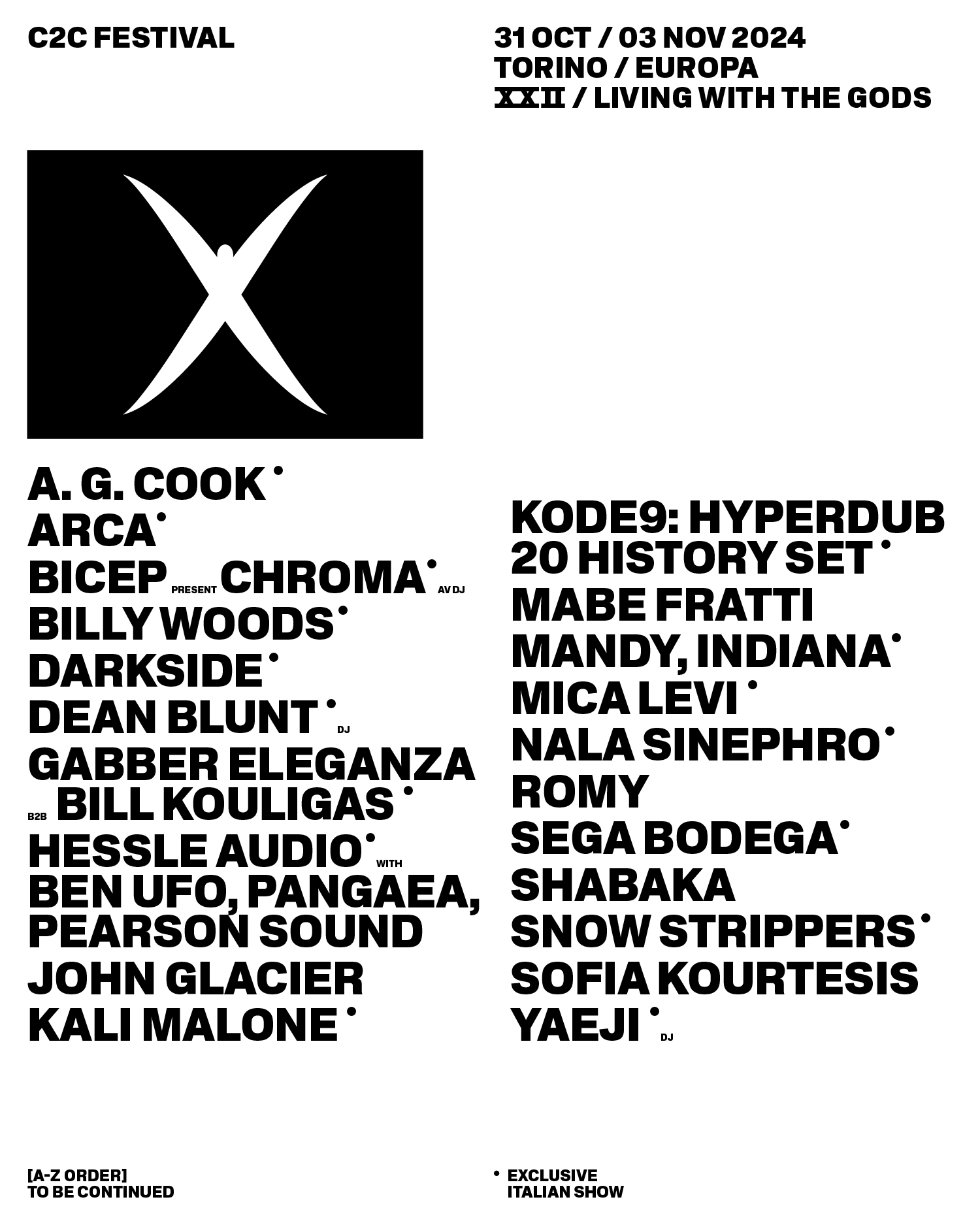 La line up artistica, tra musica pop avanzata, sperimentale, elettronica, rap, rock, jazz, pop r&b vedrà nove importanti ritorni – Arca, Bicep, Nicolas Jaar (questa volta con la band Darkside), Romy, Shabaka, Ben Ufo, Gabber Eleganza, Bill Kouligas, Kode9 – e quindici artisti per la prima volta a C2C