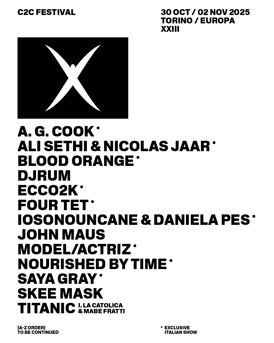 Sono otto gli altri act o progetti di scena, questi per la prima volta a C2C Festival: Ali Sethi & il fedelissimo Nicolas Jaar, Djrum con le sue magistrali selezioni perfette per ogni tipo di dancefloor, il producer di culto della Drain Gang Ecco2k, IOSONOUNCANE & Daniela Pes nell’anteprima di un inedito show collaborativo, il redivivo John Maus, l’intrigante Nourished By Time che su queste pagine ma anche all’estero ha riscosso ottimi feedback, e poi ancora l’artista canadese di origini nipponiche Saya Gray e il nuovo progetto di Mabe Fratti, Titanic. Confermate le suggestive OGR Torino, per gli appuntamenti del giovedì e della domenica, e la storica venue di Lingotto Fiere torna soltanto il venerdì e il sabato dopo l’esperimento pre-festivo del 2024.
