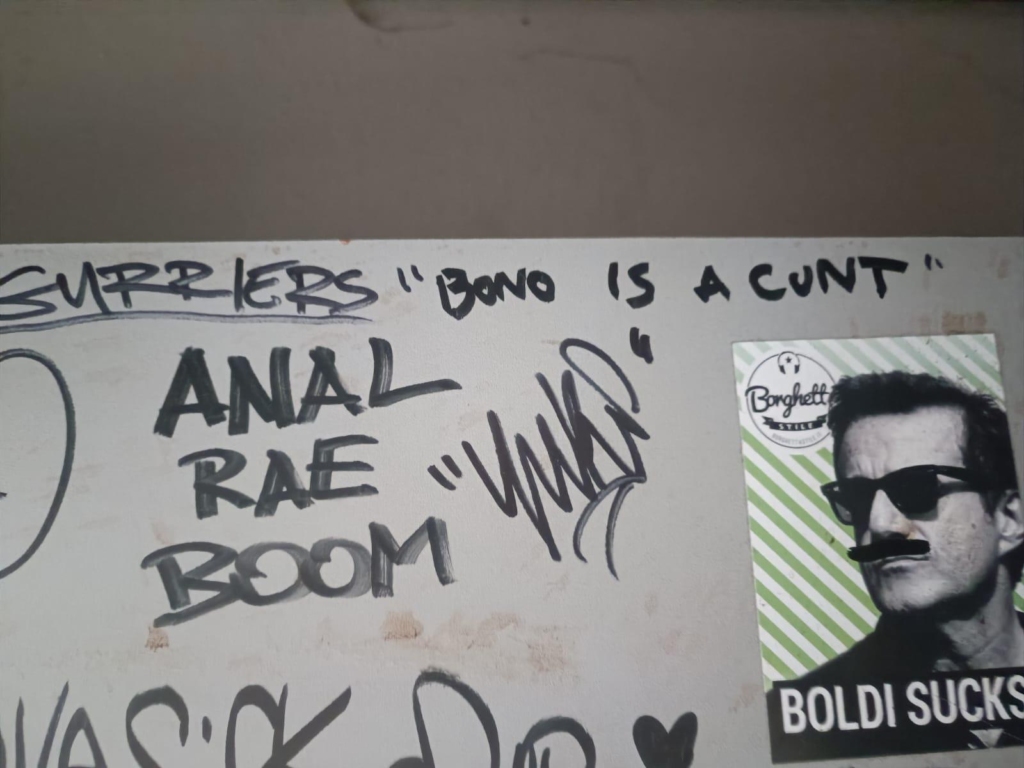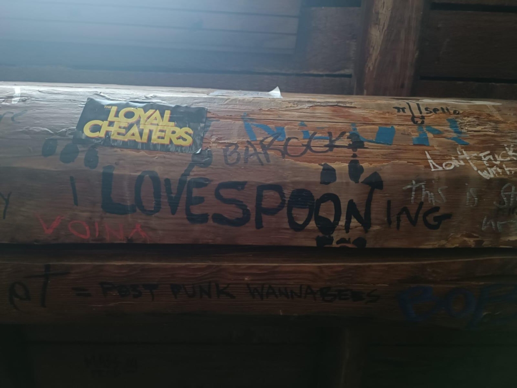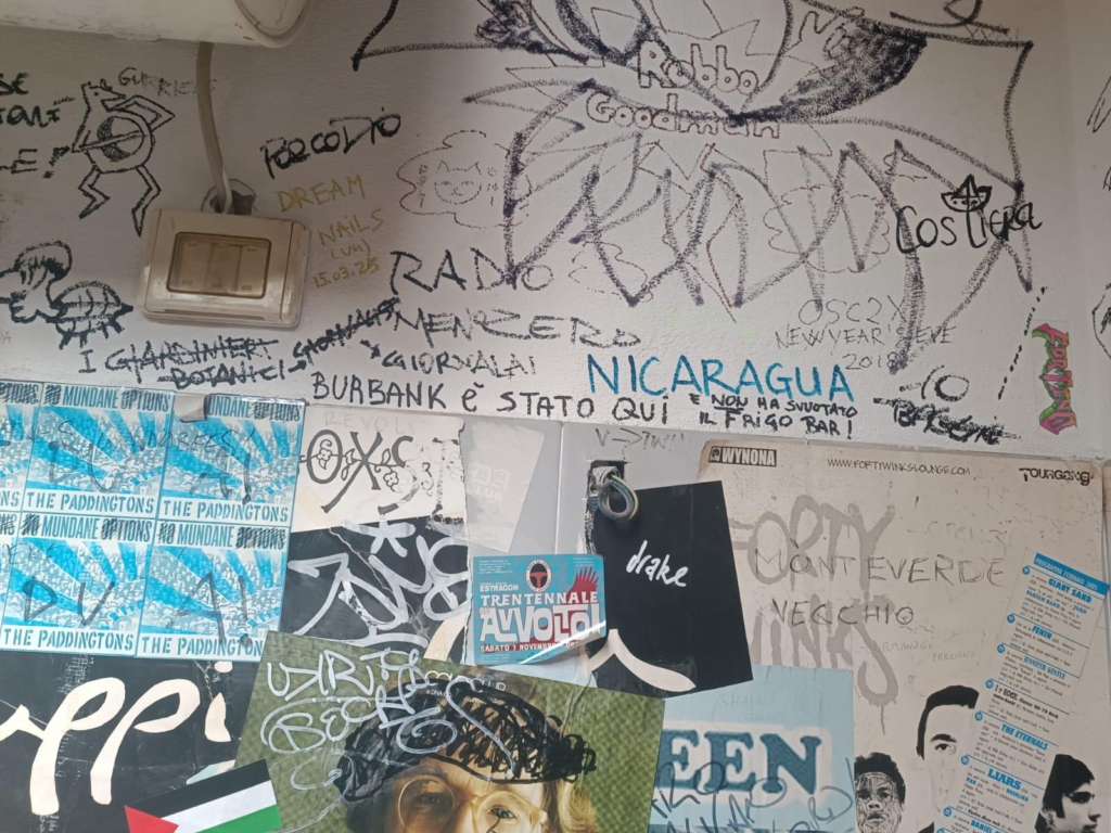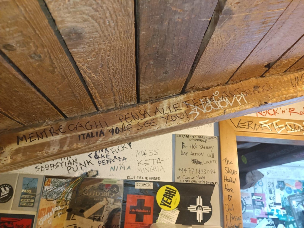 Inoltre la seconda parte di questo articolo celebrativo si compone di un insieme di graffiti presenti nei camerini del locale, quelli riservati agli artisti: tante band importanti sono passate di lì, e molte hanno lasciato una scritta o un ricordo. Andare a sbirciare quei muri è un po’ come guardare una grotta di Altamira “musicale”. Le foto sono di Gaia Cumetti.