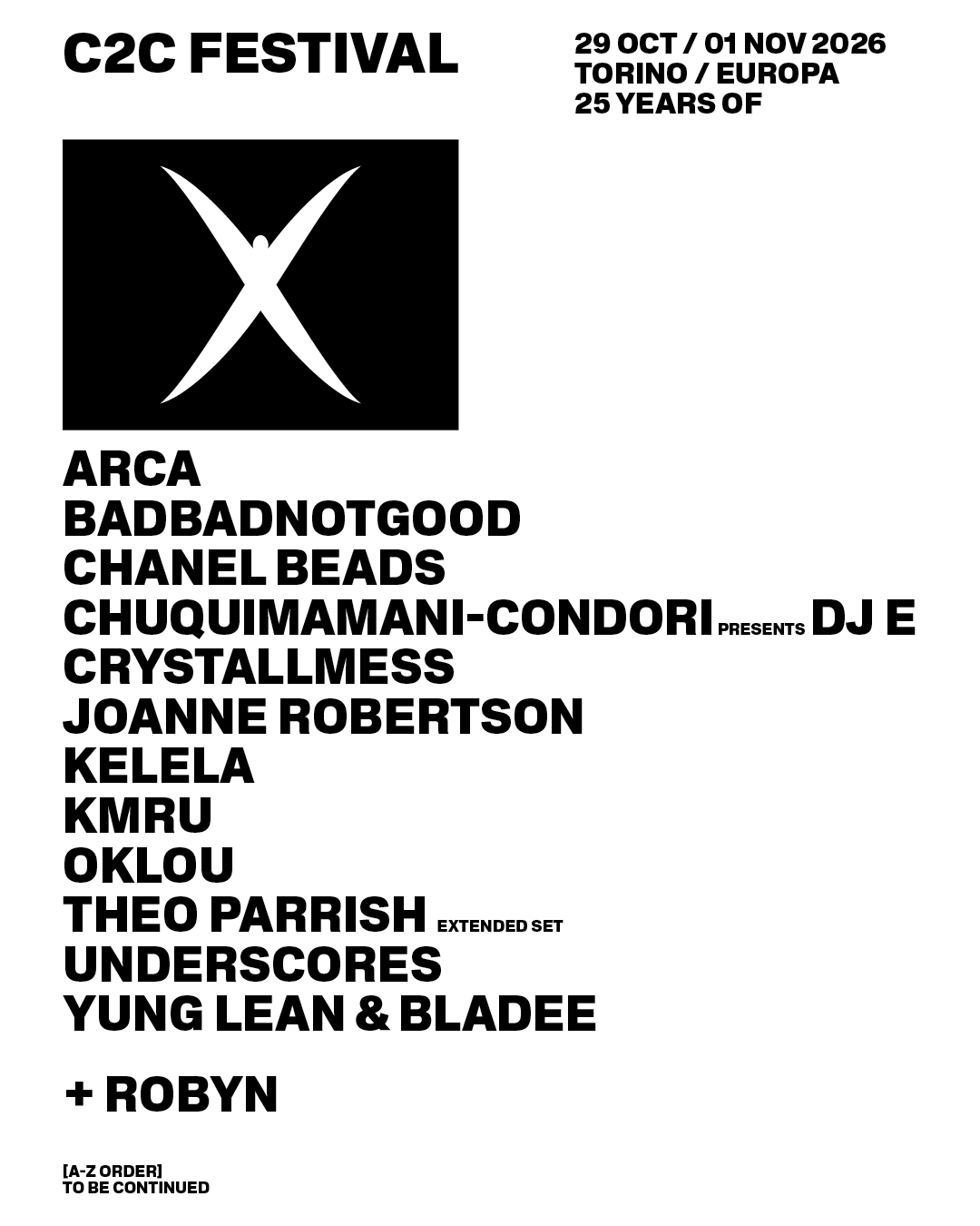 A tre mesi di distanza da una toccante edizione dedicata alla memoria di Sergio Ricciardone e dopo aver svelato la seconda edizione di C2C Festival NYC (8 maggio 2026 allo Knockdown Center del Queens), abbiamo con nove mesi di anticipo i primi nomi dell’edizione del primo quarto di secolo del festival che torna come da tradizione a Torino, dal 29 ottobre al 1° novembre 2026 tra Lingotto e OGR.