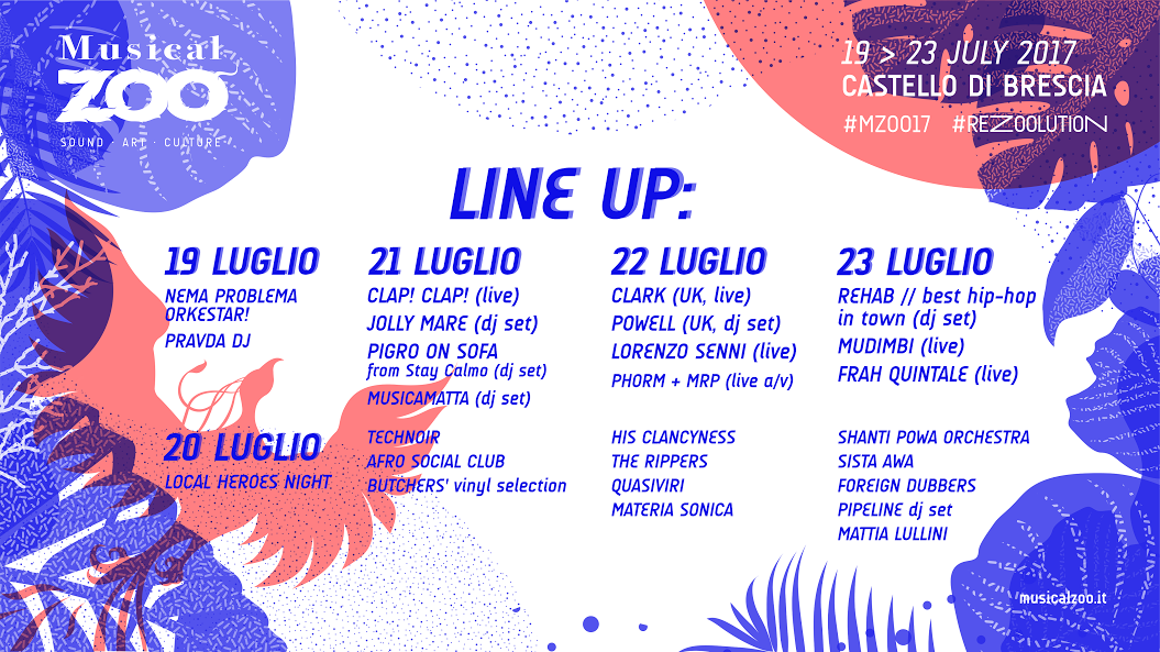 Prima di tutto Clap! Clap!, autentico alfiere della musica elettronica italiana all’estero. E poi Jolly Mare, recentemente lanciato da 42Records, che si esibirà nei panni di dj. L’italo-congolese Mudimbi e Frah Quintale rappresenteranno invece l’anima ibrida di MusicalZOO, quella aperte ad altre sonorità, in questo caso il rap. Sempre di ibridazioni si parla nominando gli His Clancyness.