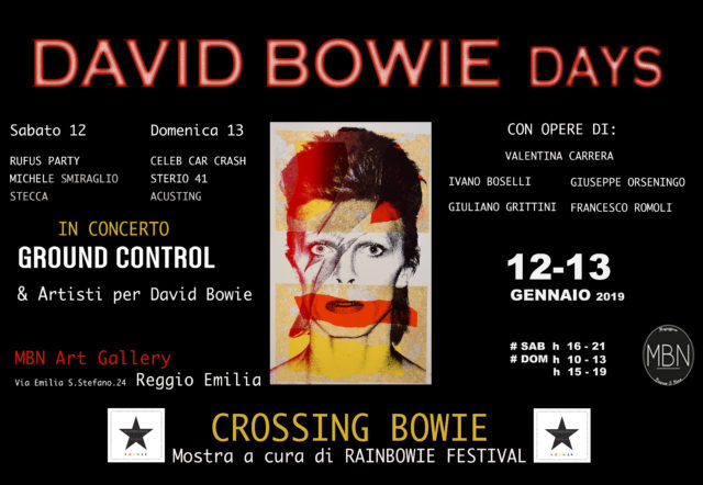 Sabato 12 e domenica 13 gennaio 2019, in occasione del terzo anniversario della scomparsa di David Bowie, verrà presentata presso la sede espositiva della MBN Art Gallery di Reggio Emilia la mostra Crossing Bowie Opere di Ivano Boselli, Valentina Carrera, Giuliano Grittini, Giuseppe Orsenigo e Francesco Romoli