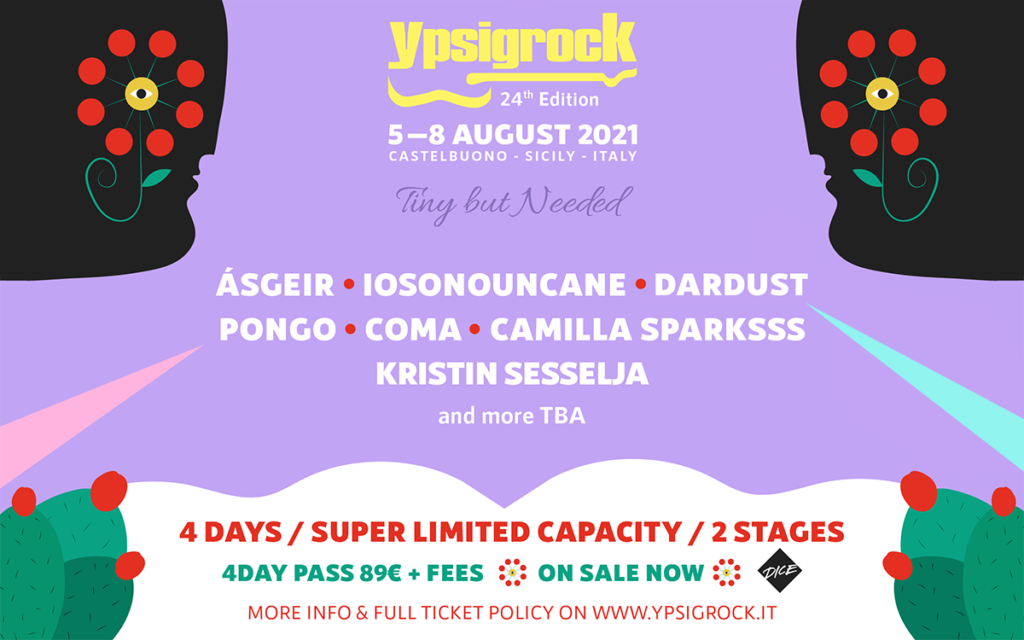 Dopo lo slittamento di un anno dovuto alla crisi sanitaria innescata dalla pandemia, Ypsigrock ritorna con la sua 24esima in versione “Tiny but Needed”. Il lungo week end musicale dell’estate italiana andrà in scena dal 5 all’8 agosto a Castelbuono, nella sua cornice naturale nel cuore del Parco delle Madonie, in forma ridotta ma che ne assicurerà il regolare svolgimento secondo le disposizioni governative che saranno in vigore al momento dell’evento, a tutela degli spettatori e delle band che si esibiranno. ÁSGEIR, IOSONOUNCANE, DARDUST, PONGO, COMA, CAMILLA SPARKSSS e KRISTIN SESSELJA sono i primi act annunciati nel cast di questa edizione particolare con le esibizioni che si svolgeranno nel centro storico di Castelbuono, su due degli iconici palchi del festival: l’Ypsi Once Stage di piazza Castello e l’Ypsi & Love Stage, all’interno del Chiostro di San Francesco.Da oggi riparte la vendita degli abbonamenti, validi 4 giorni, sulla piattaforma DICE: il numero degli abbonamenti, per via delle ridotta capacità degli stage, sarà limitata. I tagliandi saranno nominativi e ogni spettatore avrà il posto assegnato.