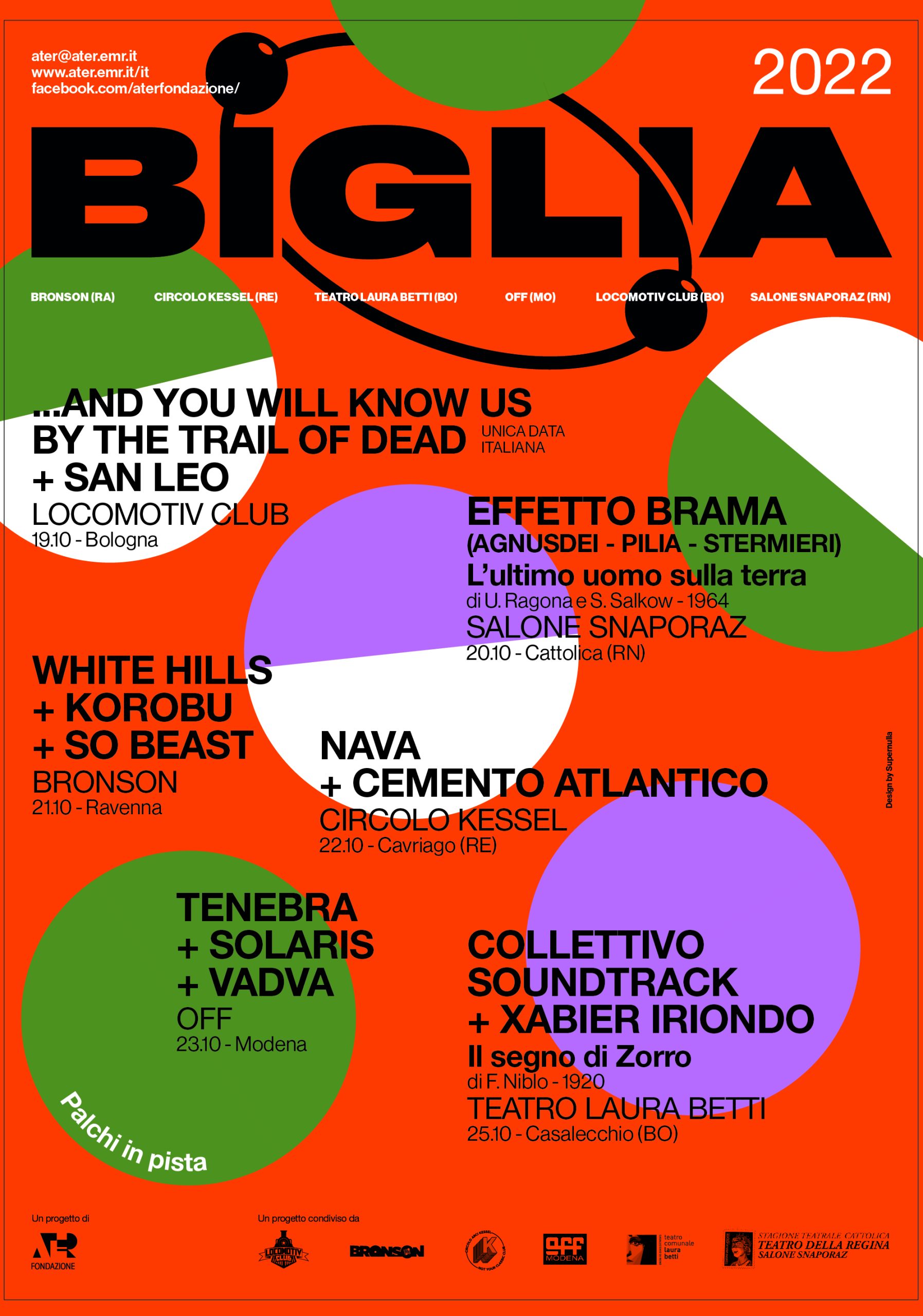 In arrivo un programma nazionale e internazionale per l’autunno di BIGLIA – palchi in pista per la musica dal vivo, il circuito ATER Fondazione dedicato alla musica dal vivo che riunisce quattro live club tra i più importanti della regione (Locomotiv Club di Bologna, Bronson di Ravenna, OFF di Modena, Circolo Arci Kessel di Cavriago, RE) insieme a due teatri del Circuito Regionale Multidisciplinare di ATER Fondazione (Teatro Comunale “Laura Betti” di Casalecchio di Reno e il Salone Snaporaz di Cattolica). Oltre all’unica data italiana a Bologna dei …And You Will Know Us by the Trail of Dead si esibiranno nei vari appuntamenti, dal 19 al 25 ottobre White Hills, Nava, Avalanche Party, Messa, Korobu, San Leo, So Beast, Cemento Atlantico, Tenebra, Vadva, Solaris(info e biglietti di tutti gli eventi sul sito di ATER Emilia-Romagna).
