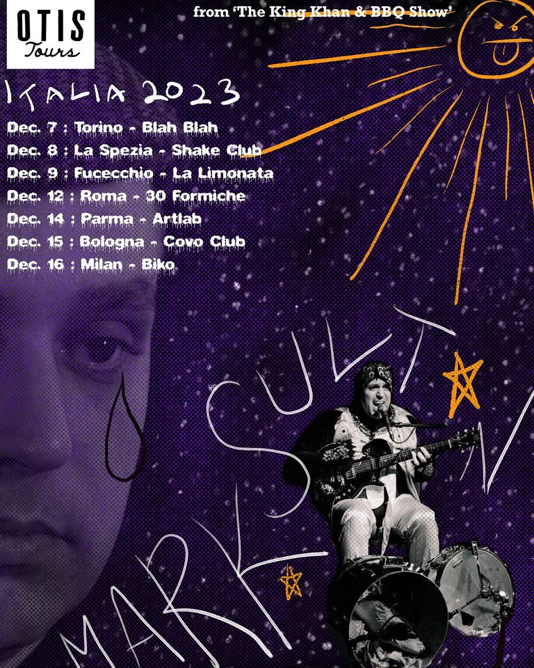 Non servono molte presentazioni per Mark Sultan, o meglio conosciuto come BBQ, ed è praticamente impossibile tenere il passo con la quantità di dischi, progetti e collaborazioni a cui si dedica. Mark Sultan è l´ambasciatore del Garage-Rock nel mondo, nonche´ la one-man-band per eccellenza dell´ultimo quindicennio. Ha militato in band seminali come Los Sexareenos, Spaceshits e piu´ recentemente The King Khan & BBQ Show e Almighty Defenders (insieme ai “fratellini” Black Lips, suoi grandi fans), con decine di dischi per etichette del calibro di Bomp!, Sympathy For The Record Industry, Norton, Crypt, Vice. Una ricetta esplosiva che combina doo-wop, il primo rock´n´roll, r´n´b, garage e punk-rock ad un songwriting d´eccezione ed una voce fenomenale e paragonata spesso a quella di Sam Cooke. Ingresso con tessera Arci.