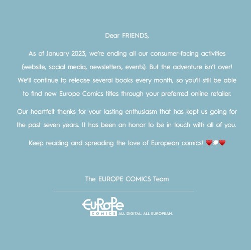 Sempre nello stesso periodo ha chiuso le porte anche il portale di vendita del sito web di Europe Comics, editore digitale che dal 2018 ha avuto come obiettivo quello di diffondere molti fumetti europei a livello internazionale traducendoli in lingua inglese, oltre ad offrire alcuni articoli e contenuti esclusivi sul proprio sito. Pur continuando le proprie operazioni editoriali, i fumetti adesso vengono venduti esclusivamente attraverso Amazon.