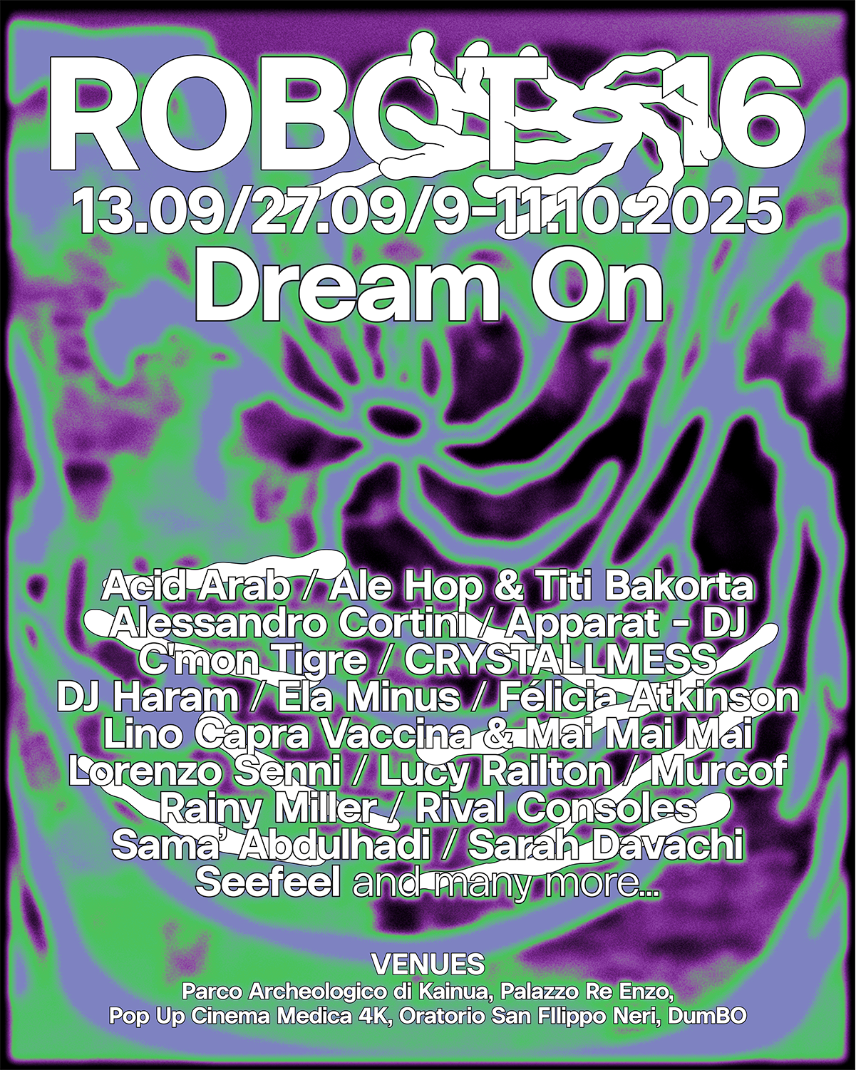 Sostenibilità ambientale ed anche sociale: nelle serate di venerdì e sabato, inoltre, sarà attivo al DumBO uno spazio di decompressione attivato in collaborazione con Beat Project, il servizio di Harm Reduction (riduzione del danno) del Comune di Bologna: un luogo aperto a tuttə dove potersi rilassare e socializzare, dove sarà disponibile acqua gratuita, zuccheri e personale qualificato per gestire situazioni di malessere. Un programma, un cartellone ed un festival ancora una volta esaustivo e profondamente eclettico, figlio e frutto del meticoloso lavoro di ricerca che prosegue tutto l’anno, tutti gli anni: “Il sogno è immaginazione, visione e proiezione: uno spazio interiore libero dalle regole della logica e del tempo” commenta Marco Ligurgo, Direttore Artistico di ROBOT Festival. “La musica, come il sogno, parla direttamente all’emotività e all’inconscio, generando stati meditativi, contemplativi, onirici. Grazie ad essa, il sogno diventa un’esperienza collettiva ad occhi aperti, un viaggio capace di condurci verso un livello superiore di consapevolezza e meraviglia.” Non a caso, nel programma di ROBOT16 saranno evidenziati 10 momenti, 10 sogni – corrispondenti ad altrettanti act e perfrmance – dove i contorni onirici del festival saranno esaltati. “DREAM ON è un rito sonoro collettivo, un sogno ad occhi aperti verso la meraviglia.”
