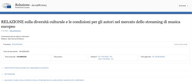 (8) RELAZIONE A9-0388/2023 sulla diversità culturale e le condizioni per gli autori nel mercato dello streaming di musica europeo, Relatore: Ibán García Del Blanco, https://www.europarl.europa.eu/doceo/document/A-9-2023-0388_IT.html#_section2, 4 dicembre 2023